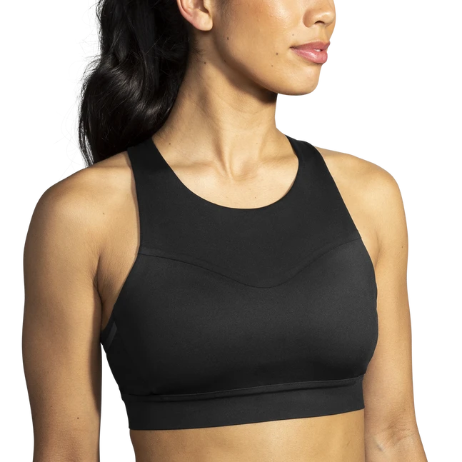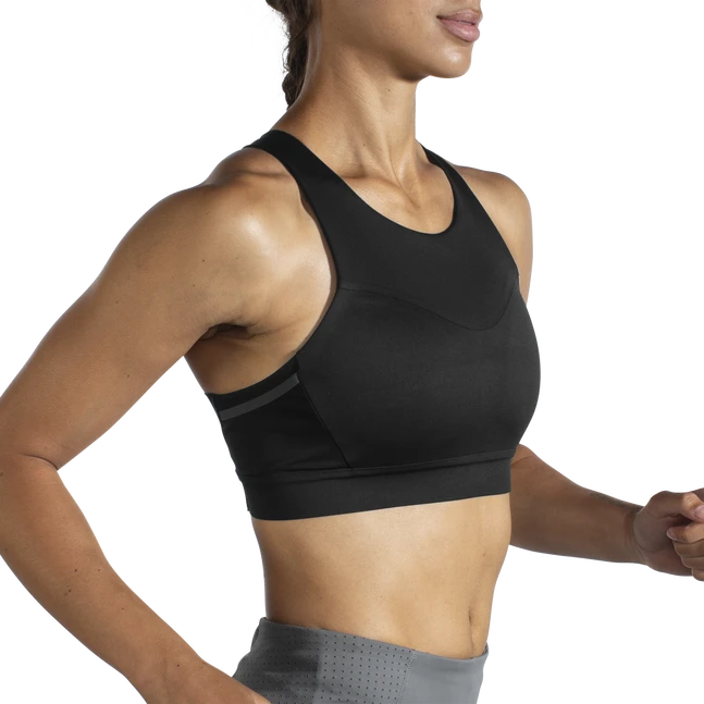 Run without worries — your search for a sports bra with phone pocket is over. This smooth, sleek bra offers motion-reducing, compressive, high-impact support and multiple pockets for storage — including one for your phone.